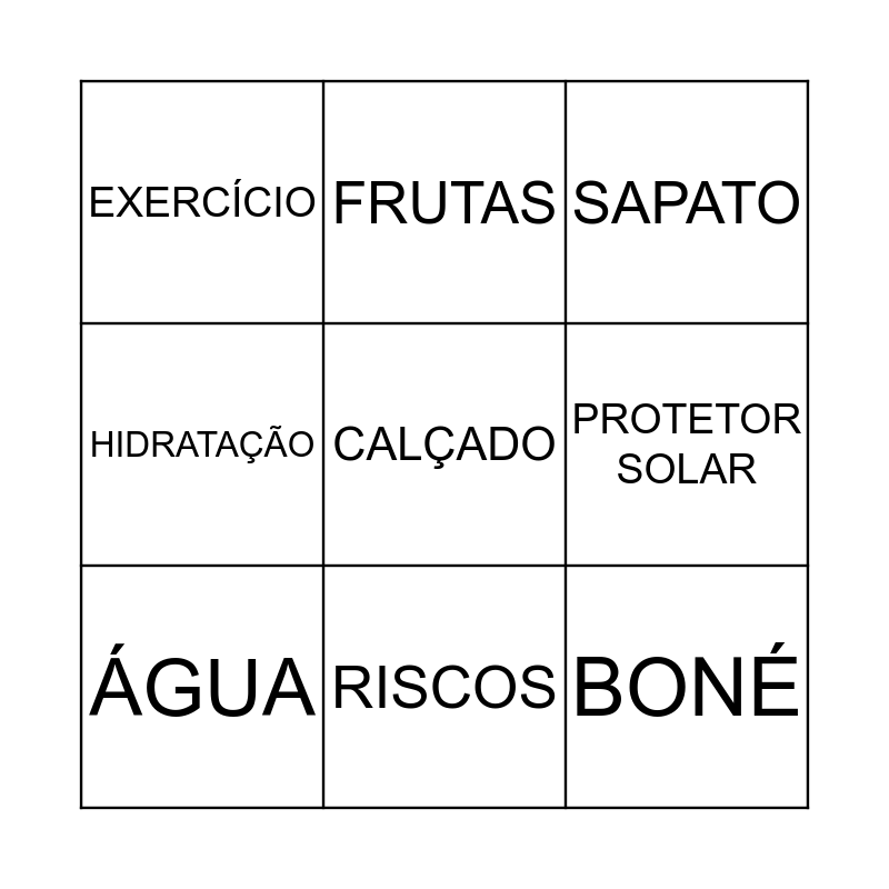 This bingo card has a free space and 8 words: PROTETOR SOLAR, SAPATO, FRUTAS, ÁGUA, EXERCÍCIO, BONÉ, HIDRATAÇÃO and RISCOS.