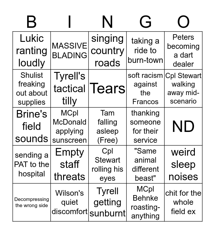 This bingo card has a free space and 24 words: Empty staff threats, Wilson's quiet discomfort, Tears, Decompressing the wrong side, Peters becoming a dart dealer, Lukic ranting loudly, Shulist freaking out about supplies, MASSIVE BLADING, thanking someone for their service, Cpl Stewart rolling his eyes, soft racism against the Francos, Brine's field sounds, "Same animal different beast", weird sleep noises, Tyrell's tactical tilly, MCpl Behnke roasting-anything, ND, singing country roads, Cpl Stewart walking away mid-scenario, MCpl McDonald applying sunscreen, chit for the whole field ex, sending a PAT to the hospital, taking a ride to burn-town and Tyrell getting sunburnt.