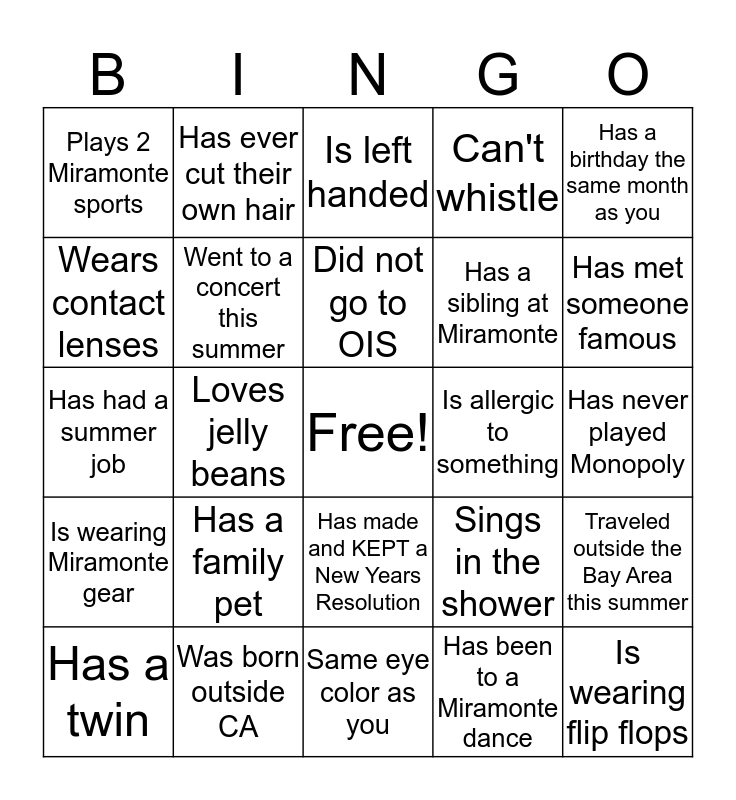 This bingo card has a free space and 24 words: Has a family pet, Was born outside CA, Did not go to OIS, Has a twin, Has a birthday the same month as you, Plays 2 Miramonte sports, Wears contact lenses, Has ever cut their own hair, Is allergic to something, Has made and KEPT a New Years Resolution, Has a sibling at Miramonte, Has had a summer job, Sings in the shower, Traveled outside the Bay Area this summer, Went to a concert this summer, Has been to a Miramonte dance, Has never played Monopoly, Is left handed, Has met someone famous, Loves jelly beans, Is wearing flip flops, Is wearing Miramonte gear, Can't whistle and Same eye color as you.