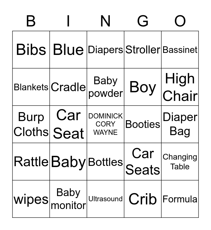 This bingo card has a free space and 24 words: Baby, Baby monitor, Baby powder, wipes, Bassinet, Bibs, Blankets, Blue, Booties, Bottles, Boy, Burp Cloths, Car Seats, Changing Table, Cradle, Crib, Diaper Bag, Diapers, High Chair, Car Seat, Formula, Rattle, Stroller and Ultrasound.