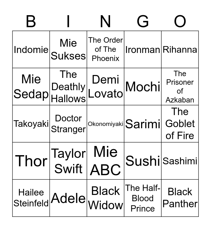 This bingo card has a free space and 24 words: Taylor Swift, Adele, Demi Lovato, Hailee Steinfeld, Rihanna, Indomie, Mie Sedap, Mie Sukses, Sarimi, Mie ABC, Mochi, Takoyaki, Sushi, Sashimi, The Deathly Hallows, The Half-Blood Prince, The Goblet of Fire, The Order of The Phoenix, The Prisoner of Azkaban, Doctor Stranger, Black Panther, Thor, Ironman and Black Widow.