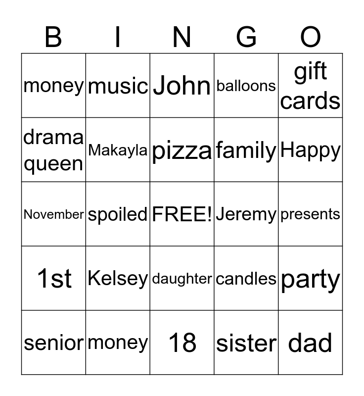 This bingo card has a free space and 29 words: senior, cake, spoiled, talker, money, John, Makayla, Kelsey, Jeremy, money, presents, dad, 18, sister, Happy, cards, daughter, 1st, gift cards, November, candles, softball, family, drama queen, balloons, music, party, pizza and chips.