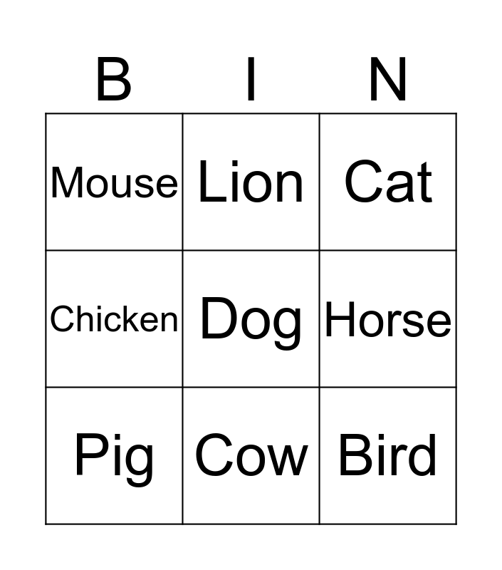 This bingo card has a free space and 8 words: Horse, Cat, Lion, Pig, Mouse, Bird, Chicken and Cow.