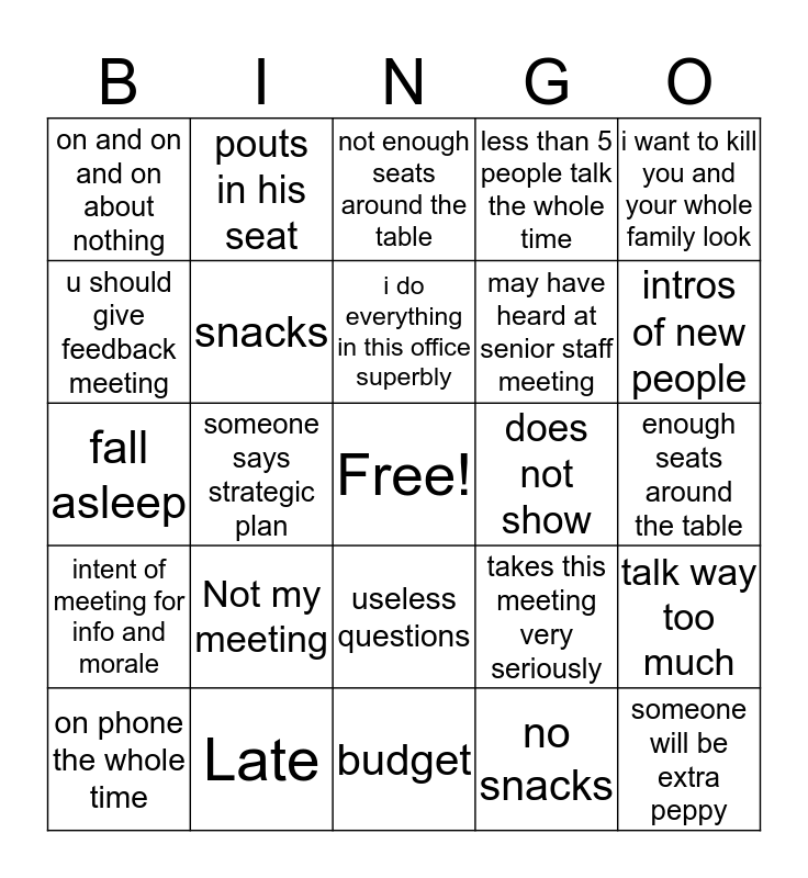 This bingo card has a free space and 24 words: Not my meeting, Late, i do everything in this office superbly, on phone the whole time, i want to kill you and your whole family look, on and on and on about nothing, u should give feedback meeting, pouts in his seat, does not show, useless questions, may have heard at senior staff meeting, fall asleep, takes this meeting very seriously, talk way too much, snacks, no snacks, enough seats around the table, not enough seats around the table, intros of new people, someone says strategic plan, someone will be extra peppy, intent of meeting for info and morale, less than 5 people talk the whole time and budget.