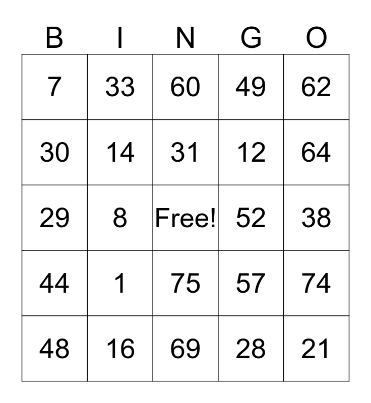 This bingo card has a free space and 24 words: 1, 16, 31, 48, 62, 7, 30, 33, 52, 75, 12, 29, 57, 74, 14, 28, 38, 60, 64, 8, 21, 44, 49 and 69.