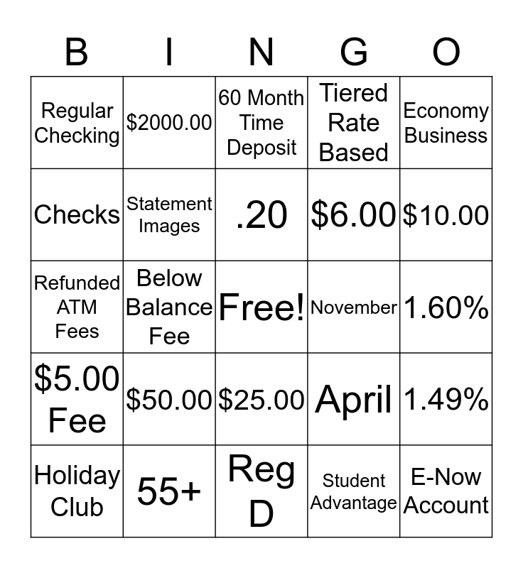This bingo card has a free space and 24 words: $50.00, 55+, .20, Holiday Club, Economy Business, Regular Checking, Checks, $2000.00, November, $25.00, $6.00, Refunded ATM Fees, April, 1.49%, Statement Images, Student Advantage, 1.60%, 60 Month Time Deposit, $10.00, Below Balance Fee, E-Now Account, $5.00 Fee, Tiered Rate Based and Reg D.