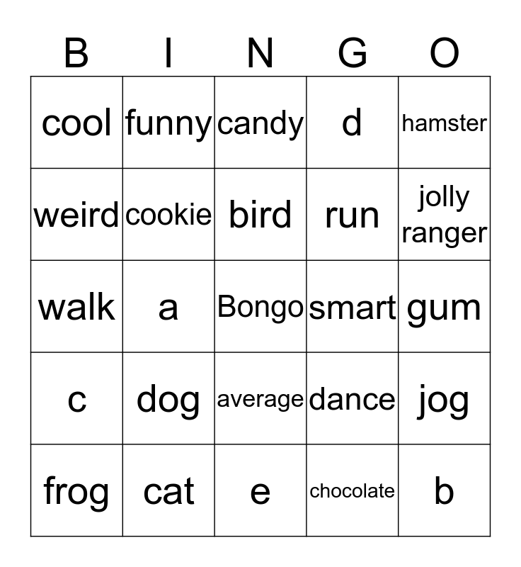 This bingo card has a free space and 24 words: dog, cat, bird, frog, hamster, cool, weird, funny, smart, average, run, walk, dance, jog, cookie, chocolate, gum, candy, jolly ranger, a, b, c, d and e.