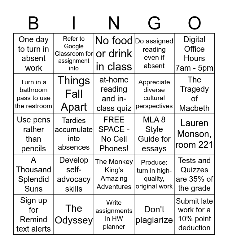 This bingo card has a free space and 24 words: Develop self-advocacy skills, The Odyssey, at-home reading and in-class quiz, Sign up for Remind text alerts, Digital Office Hours 7am - 5pm, One day to turn in absent work, Turn in a bathroom pass to use the restroom, Refer to Google Classroom for assignment info, MLA 8 Style Guide for essays, The Monkey King's Amazing Adventures, Appreciate diverse cultural perspectives, Use pens rather than pencils, Produce: turn in high-quality, original work, Tests and Quizzes are 35% of the grade, Things Fall Apart, Don't plagiarize, Lauren Monson, room 221, No food or drink in class, The Tragedy of Macbeth, Tardies accumulate into absences, Submit late work for a 10% point deduction, A Thousand Splendid Suns, Do assigned reading even if absent and Write assignments in HW planner.