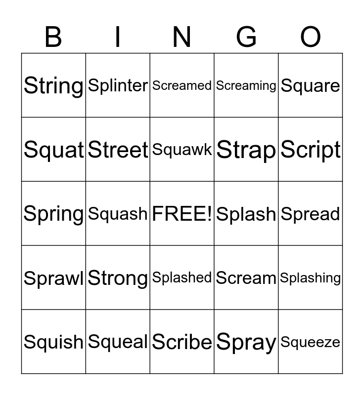 This bingo card has a free space and 24 words: Strong, Squeal, Squawk, Squish, Square, String, Squat, Splinter, Splash, Splashed, Strap, Spring, Scream, Splashing, Street, Spray, Spread, Screamed, Script, Squash, Squeeze, Sprawl, Screaming and Scribe.