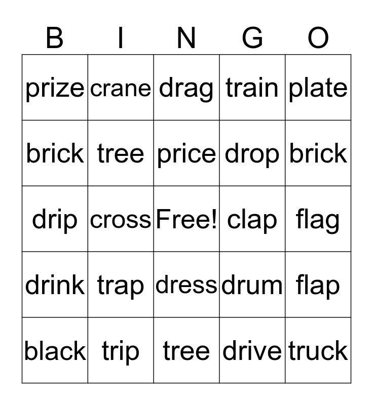 This bingo card has a free space and 24 words: trap, trip, price, black, plate, prize, brick, crane, clap, dress, drop, drip, drum, flap, tree, drive, flag, drag, brick, cross, truck, drink, train and tree.