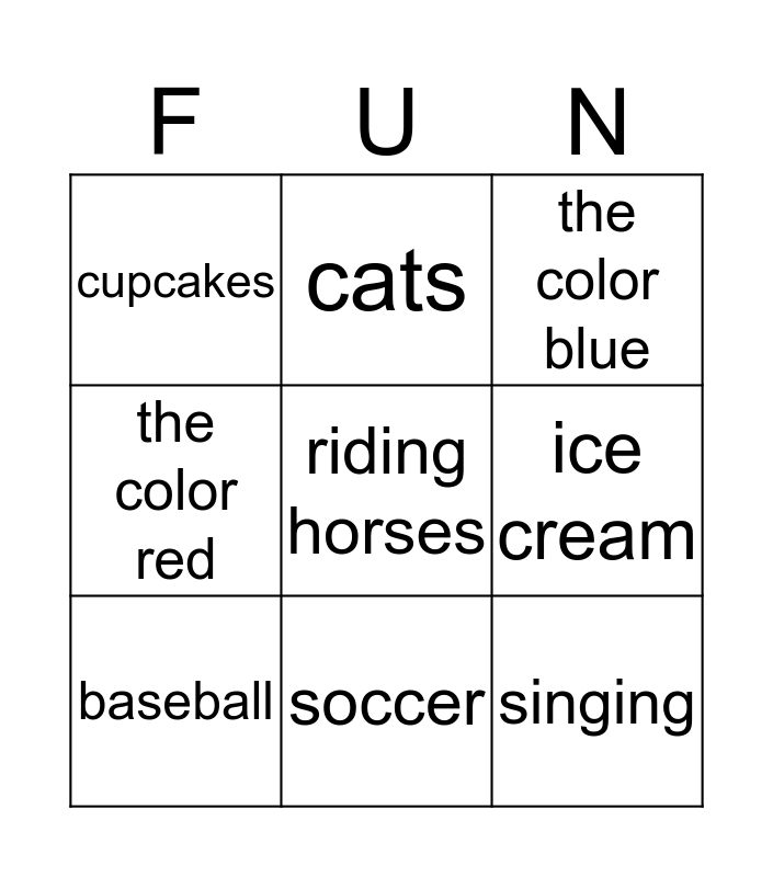 This bingo card has a free space and 20 words: going outside, playing with friends, the color blue, playing computer games, reading, singing, chicken nuggets, cupcakes, Miss Morris, cats, dogs, math, ice cream, the color pink, baseball, football, soccer, the color red, snack time and being silly.