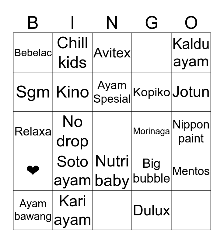 This bingo card has a free space and 21 words: Soto ayam, Kari ayam, Ayam Spesial, Ayam bawang, Kaldu ayam, Bebelac, Sgm, Chill kids, Morinaga, Nutri baby, Kopiko, Relaxa, Big bubble, Mentos, Kino, Dulux, Nippon paint, Avitex, Jotun, No drop and ❤.