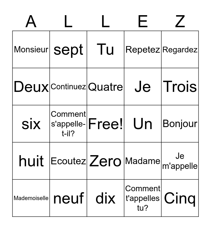 This bingo card has a free space and 24 words: Ecoutez, neuf, Quatre, Mademoiselle, Regardez, Monsieur, Deux, sept, Un, Zero, Je, six, Madame, Je m'appelle, Continuez, Comment t'appelles tu?, Bonjour, Tu, Trois, Comment s'appelle-t-il?, Cinq, huit, Repetez and dix.