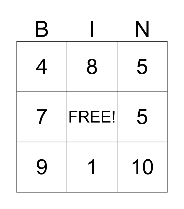 This bingo card has 25 words: 3, 6, 1, 2, FREE!, 4, 5, 8, 7, 9, 10, 1, 2, 8, 9, 10, 3, 5, 4, 2, 6, 8, 9, 7 and 1.