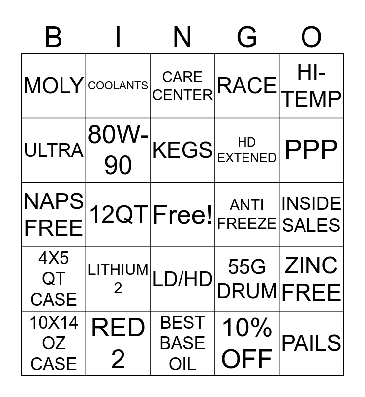 This bingo card has a free space and 24 words: LITHIUM 2, RED 2, KEGS, 10X14 OZ CASE, HI-TEMP, MOLY, ULTRA, COOLANTS, ANTI FREEZE, LD/HD, HD EXTENED, NAPS FREE, 55G DRUM, ZINC FREE, 80W-90, 10% OFF, INSIDE SALES, CARE CENTER, PPP, 12QT, PAILS, 4X5 QT CASE, RACE and BEST BASE OIL.