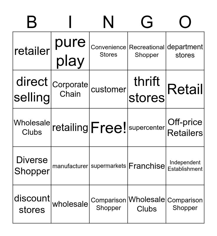 This bingo card has a free space and 24 words: manufacturer, wholesale, customer, discount stores, department stores, retailer, direct selling, pure play, supercenter, supermarkets, thrift stores, Wholesale Clubs, Franchise, Independent Establishment, Corporate Chain, Wholesale Clubs, Off-price Retailers, Convenience Stores, Retail, retailing, Comparison Shopper, Diverse Shopper, Recreational Shopper and Comparison Shopper.