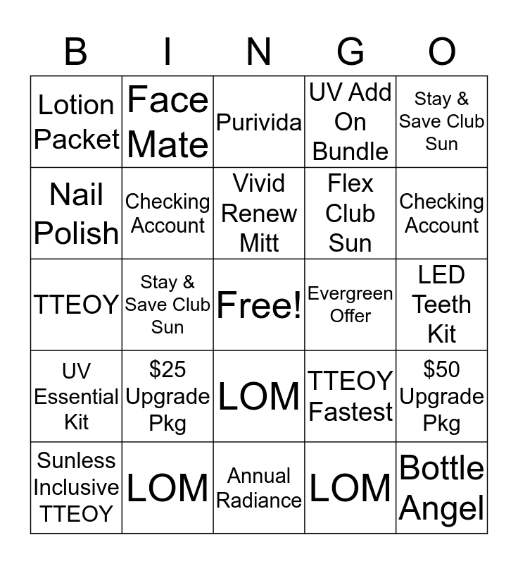 This bingo card has a free space and 24 words: Sunless Inclusive TTEOY, $25 Upgrade Pkg, Vivid Renew Mitt, LOM, Stay & Save Club Sun, Lotion Packet, Face Mate, Purivida, Evergreen Offer, LED Teeth Kit, TTEOY, Checking Account, TTEOY Fastest, $50 Upgrade Pkg, Nail Polish, LOM, Annual Radiance, UV Add On Bundle, Checking Account, UV Essential Kit, Stay & Save Club Sun, LOM, Flex Club Sun and Bottle Angel.
