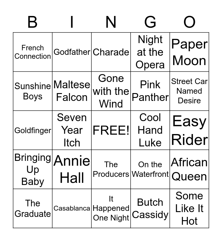 This bingo card has a free space and 24 words: Annie Hall, Casablanca, Gone with the Wind, The Graduate, Paper Moon, French Connection, Sunshine Boys, Godfather, Cool Hand Luke, The Producers, Pink Panther, Goldfinger, On the Waterfront, African Queen, Maltese Falcon, Butch Cassidy, Easy Rider, Charade, Street Car Named Desire, Seven Year Itch, Some Like It Hot, Bringing Up Baby, Night at the Opera and It Happened One Night.