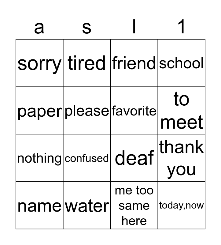 This bingo card has 16 words: name, water, friend, school, paper, tired, deaf, thank you, sorry, please, me too same here, to meet, nothing, confused, favorite and today,now.