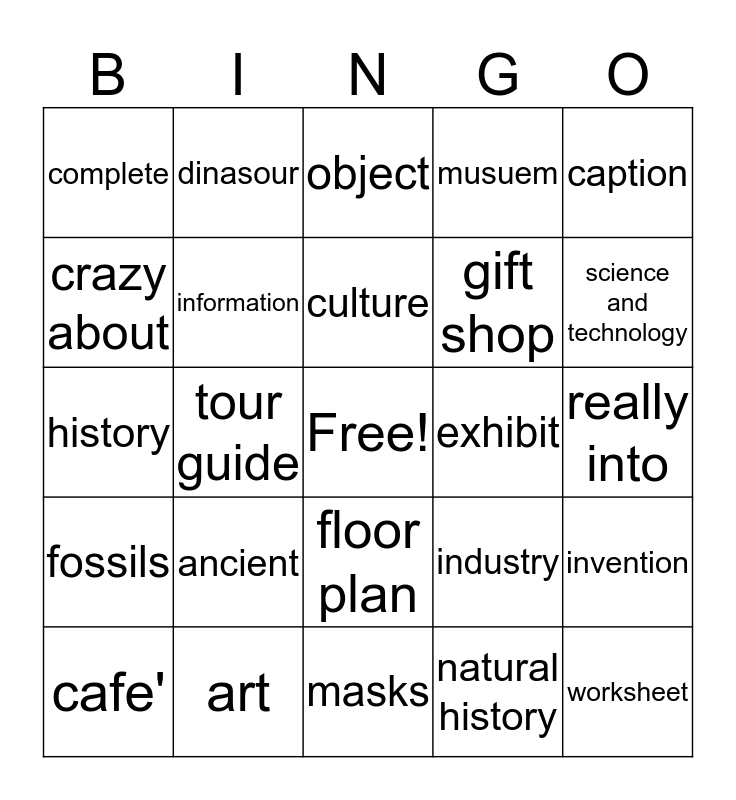 This bingo card has a free space and 24 words: ancient, art, culture, cafe', caption, complete, crazy about, dinasour, exhibit, floor plan, gift shop, history, industry, invention, information, natural history, really into, object, science and technology, tour guide, worksheet, fossils, musuem and masks.