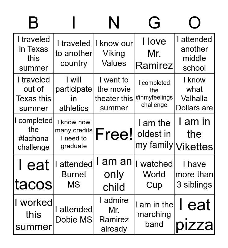 This bingo card has a free space and 24 words: I attended Burnet MS, I attended Dobie MS, I went to the movie theater this summer, I worked this summer, I attended another middle school, I traveled in Texas this summer, I traveled out of Texas this summer, I traveled to another country, I am the oldest in my family, I am an only child, I completed the #inmyfeelings challenge, I completed the #lachona challenge, I watched World Cup, I have more than 3 siblings, I will participate in athletics, I am in the marching band, I am in the Vikettes, I know our Viking Values, I know what Valhalla Dollars are, I know how many credits I need to graduate, I eat pizza, I eat tacos, I love Mr. Ramirez and I admire Mr. Ramirez already.