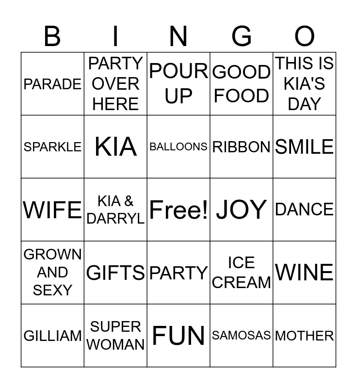 This bingo card has a free space and 39 words: THANKFUL, KEKE DO YOU LOVE ME, SO FLY, KIA, GILLIAM, PARTY, BALLOONS, MUSIC, THIS IS KIA'S DAY, GROWN AND SEXY, KIA & DARRYL, GOOD FOOD, MOTHER, DANCE, JOY, GIFTS, PARTY WITH KIA, PARADE, HAPPY, ICE CREAM, SPARKLE, FUN, RIBBON, SMILE, DRINK UP, BLESSED, FREINDS, FAMILY, QUEEN OF SOUL, PARTY OVER HERE, JUST FOR KIA, CUPCAKES, POUR UP, SUPER WOMAN, SAMOSAS, BIRTHDAY CAKE, WINE, WIFE and FAMILY OVER EVERYTHING.