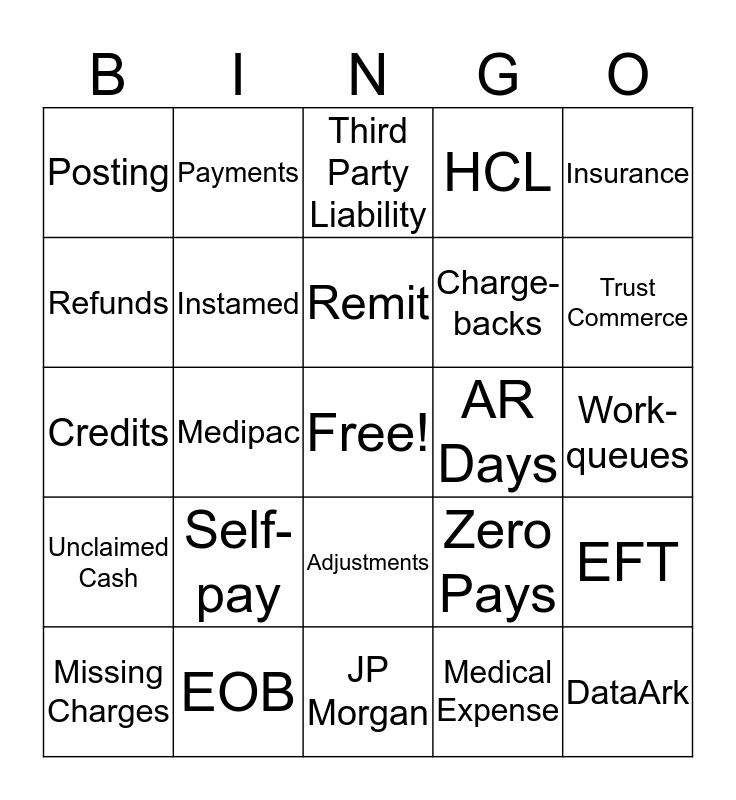 This bingo card has a free space and 24 words: Self-pay, EOB, Remit, Missing Charges, Insurance, Posting, Refunds, Payments, AR Days, Adjustments, Charge-backs, Credits, Zero Pays, EFT, Instamed, Medical Expense, Work-queues, Third Party Liability, Trust Commerce, Medipac, DataArk, Unclaimed Cash, HCL and JP Morgan.