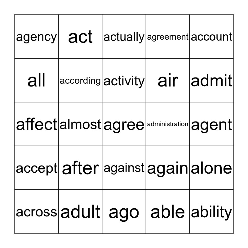 This bingo card has 34 words: ability, able, about, above, accept, according, account, across, act, action, activity, actually, add, address, administration, admit, adult, affect, after, again, against, age, agency, agent, ago, agree, agreement, ahead, air, all, allow, almost, alone and along.