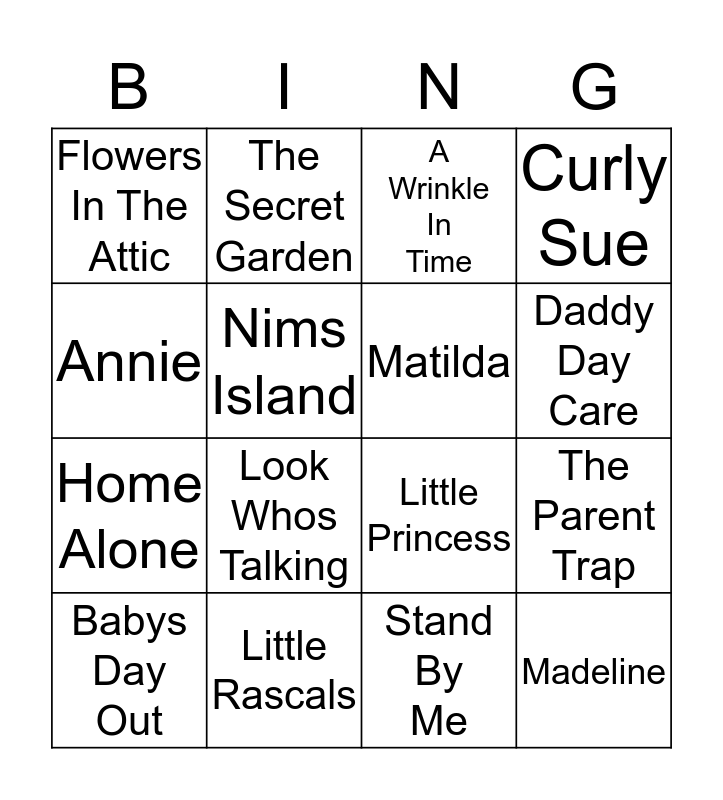 This bingo card has 16 words: Little Rascals, The Parent Trap, A Wrinkle In Time, Flowers In The Attic, Home Alone, The Secret Garden, Little Princess, Stand By Me, Annie, Nims Island, Babys Day Out, Curly Sue, Look Whos Talking, Daddy Day Care, Matilda and Madeline.