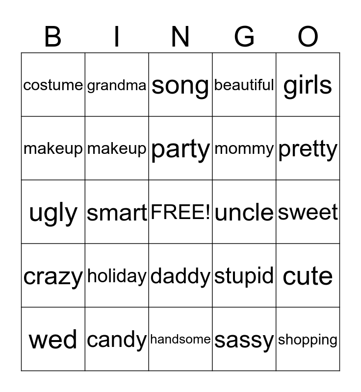This bingo card has a free space and 24 words: holiday, candy, party, wed, girls, costume, makeup, grandma, uncle, daddy, mommy, ugly, stupid, cute, makeup, sassy, sweet, song, pretty, smart, shopping, crazy, beautiful and handsome.