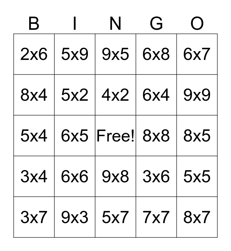 This bingo card has a free space and 24 words: 6x6, 9x3, 4x2, 3x7, 6x7, 2x6, 8x4, 5x9, 8x8, 9x8, 6x4, 5x4, 3x6, 5x5, 5x2, 7x7, 8x5, 9x5, 9x9, 6x5, 8x7, 3x4, 6x8 and 5x7.