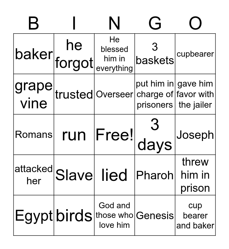 This bingo card has a free space and 24 words: Egypt, Slave, Overseer, Genesis, cupbearer, baker, he forgot, He blessed him in everything, 3 days, Joseph, Romans, trusted, Pharoh, threw him in prison, grape vine, birds, God and those who love him, 3 baskets, gave him favor with the jailer, attacked her, run, lied, put him in charge of prisoners and cup bearer and baker.