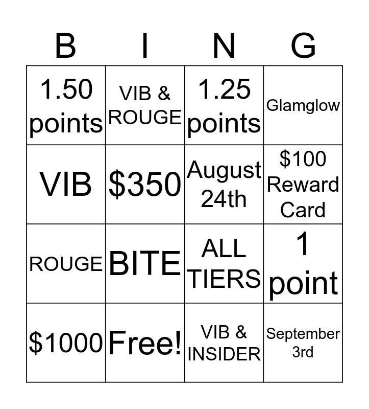 This bingo card has 16 words: Free!, 1 point, 1.25 points, 1.50 points, ROUGE, VIB & ROUGE, ALL TIERS, VIB & INSIDER, VIB, $350, $1000, Glamglow, BITE, $100 Reward Card, August 24th and September 3rd.
