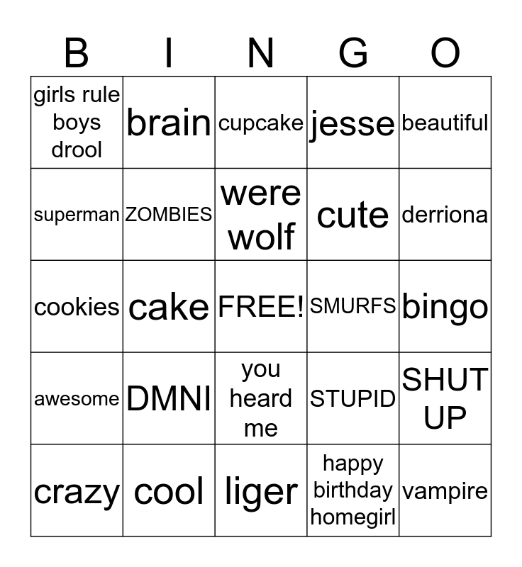 This bingo card has a free space and 24 words: DMNI, cool, were wolf, crazy, beautiful, girls rule boys drool, superman, brain, SMURFS, you heard me, cute, cookies, STUPID, SHUT UP, ZOMBIES, happy birthday homegirl, bingo, cupcake, derriona, cake, vampire, awesome, jesse and liger.