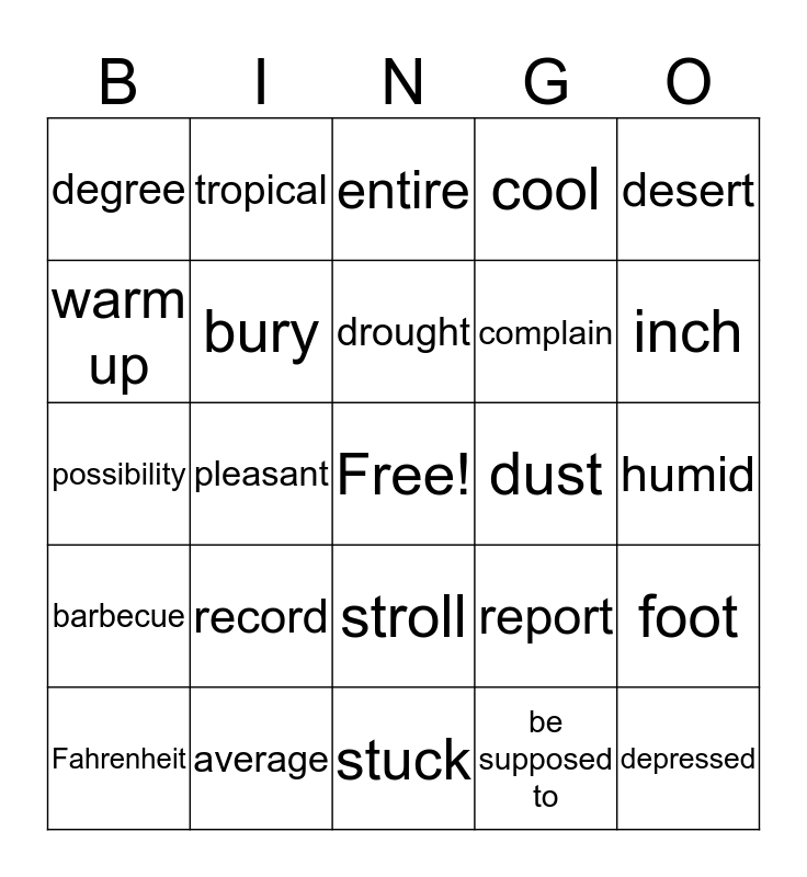 This bingo card has a free space and 58 words: a bit, average, awful, barbecue, be supposed to, bloom, bury, Celsius, complain, continent, cool, cool down / off, cover, crowded, damp, degree, depressed, desert, drop, drought, dust, entire, Fahrenheit, foot, freezing, humid, humidity, imaginary, inch, increase, lightning, likely, mainland, mild, miserable, native, picnic, pleasant, possibility, preparation, record, remove, report, rest, rise, soaked, strike, stroll, stuck, sunburn, sunlight, take place, tan, throughout, tropical, unknown, warm up and weather forecast.