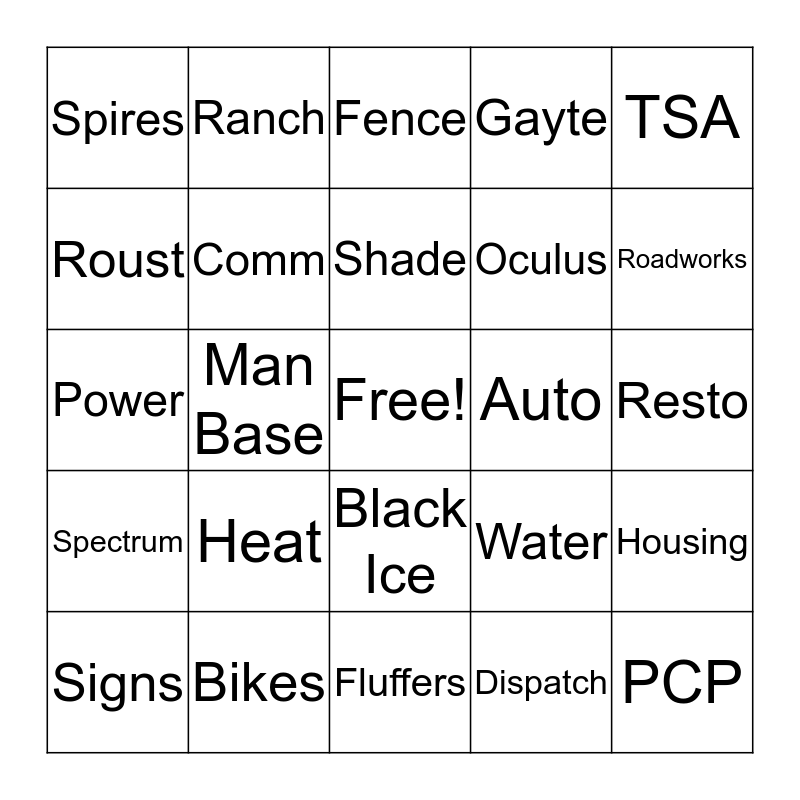 This bingo card has a free space and 24 words: Heat, Bikes, Shade, Signs, TSA, Spires, Roust, Ranch, Auto, Black Ice, Oculus, Power, Water, Housing, Comm, Dispatch, Resto, Fence, Roadworks, Man Base, PCP, Spectrum, Gayte and Fluffers.