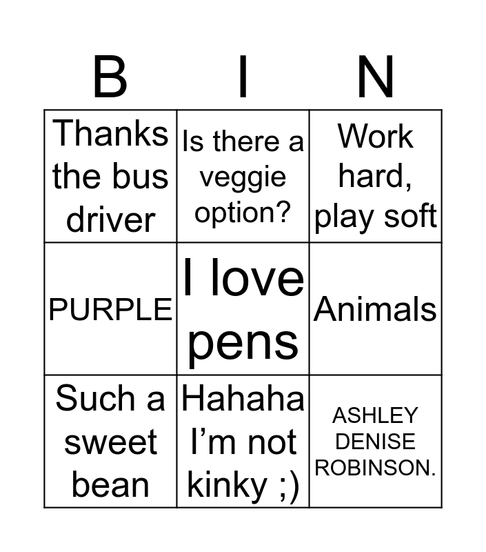 This bingo card has 9 words: Such a sweet bean, Work hard, play soft, Is there a veggie option?, PURPLE, Thanks the bus driver, Animals, I love pens, ASHLEY DENISE ROBINSON. and Hahaha I’m not kinky ;).