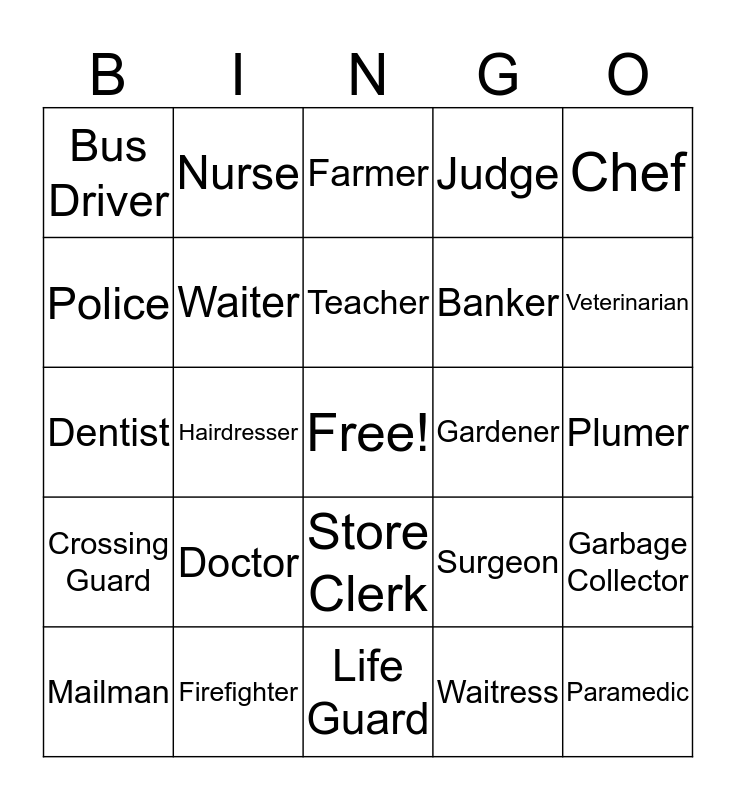 This bingo card has a free space and 24 words: Doctor, Firefighter, Teacher, Mailman, Chef, Bus Driver, Police, Nurse, Gardener, Store Clerk, Banker, Dentist, Surgeon, Garbage Collector, Waiter, Waitress, Plumer, Farmer, Veterinarian, Hairdresser, Paramedic, Crossing Guard, Judge and Life Guard.