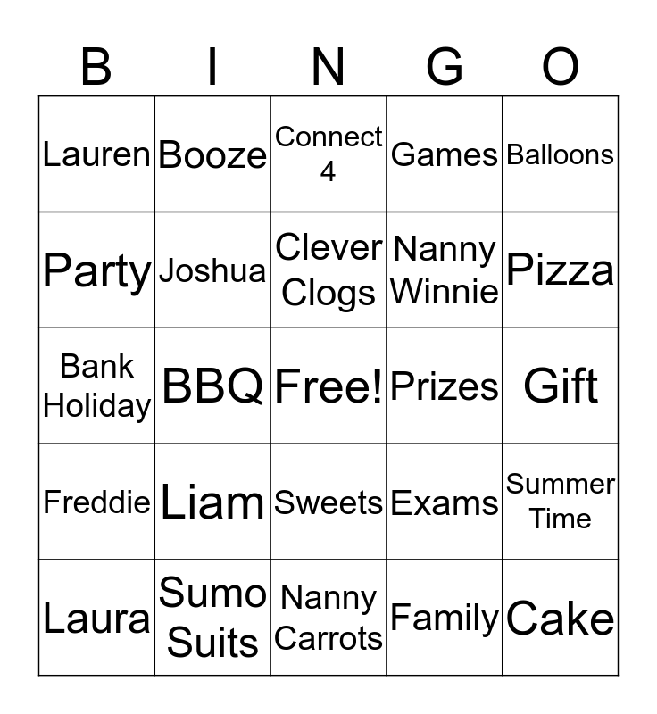 This bingo card has a free space and 39 words: 30, Banners, Burgers, Joshua, Laura, Sweets, Clever Clogs, Candles, Balloons, Freddie, BBQ, Games, Cake, Gift, Prizes, Liam, Birthday, Lauren, GCSE's, Exams, Party, Nanny Carrots, Nanny Winnie, Pizza, Streamers, Cards, Sausages, Tomato Sauce, Paper Plates, Booze, Beer, Bingo Cards, Connect 4, Sumo Suits, Family, Celebrate, Summer Time, Bank Holiday and Garden.