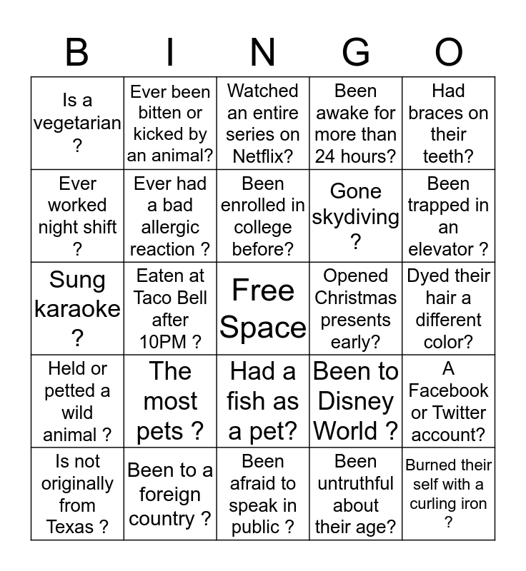 This bingo card has a free space and 24 words: The most pets ?, Been to a foreign country ?, Been enrolled in college before?, Is not originally from Texas ?, Had braces on their teeth?, Is a vegetarian ?, Ever worked night shift ?, Ever been bitten or kicked by an animal?, Opened Christmas presents early?, Had a fish as a pet?, Gone skydiving ?, Sung karaoke ?, Been to Disney World ?, A Facebook or Twitter account?, Ever had a bad allergic reaction ?, Been untruthful about their age?, Dyed their hair a different color?, Watched an entire series on Netflix?, Been trapped in an elevator ?, Eaten at Taco Bell after 10PM ?, Burned their self with a curling iron ?, Held or petted a wild animal ?, Been awake for more than 24 hours? and Been afraid to speak in public ?.