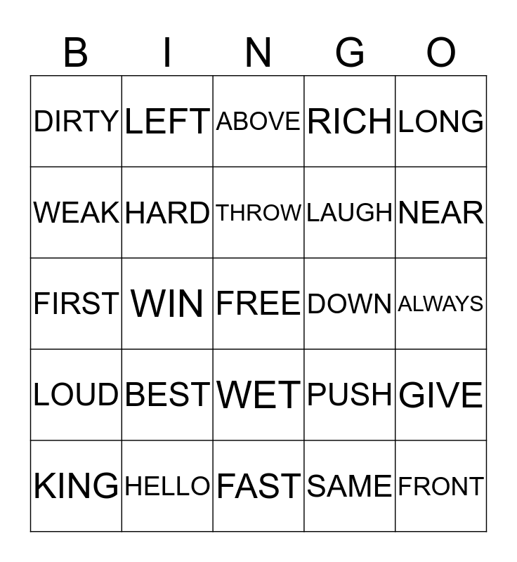 This bingo card has a free space and 24 words: BEST, HELLO, THROW, KING, LONG, DIRTY, WEAK, LEFT, DOWN, WET, LAUGH, FIRST, PUSH, GIVE, HARD, SAME, ALWAYS, ABOVE, NEAR, WIN, FRONT, LOUD, RICH and FAST.
