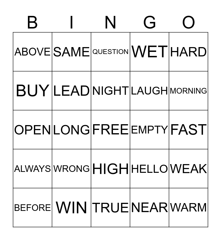 This bingo card has a free space and 24 words: WRONG, WIN, NIGHT, BEFORE, HARD, ABOVE, BUY, SAME, EMPTY, HIGH, LAUGH, OPEN, HELLO, WEAK, LEAD, NEAR, FAST, QUESTION, MORNING, LONG, WARM, ALWAYS, WET and TRUE.