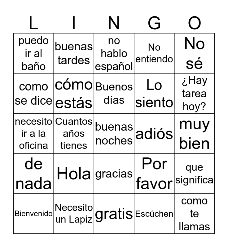 This bingo card has a free space and 24 words: Hola, Necesito un Lapiz, Buenos días, Bienvenido, No sé, puedo ir al baño, como se dice, buenas tardes, adiós, gracias, Lo siento, necesito ir a la oficina, Por favor, que significa, cómo estás, Escúchen, muy bien, no hablo español, ¿Hay tarea hoy?, Cuantos años tienes, como te llamas, de nada, No entiendo and gratis.