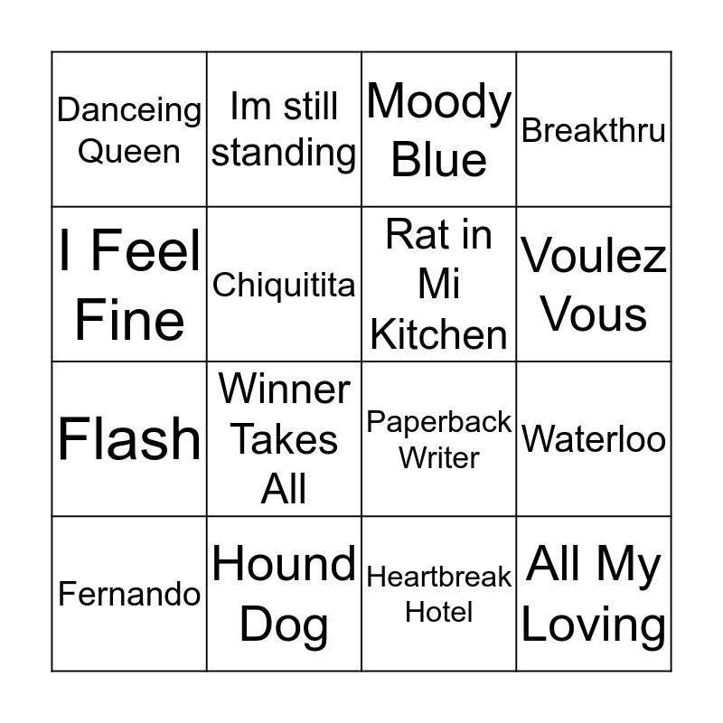 This bingo card has 54 words: Hard Day's Night, All My Loving, All Shook Up, Bicycle Race, Blue Suede Shoes, Bohemien Rapsody, Breakthru, Cherry Oh Baby, Chiquitita, Crocodile Rock, Danceing Queen, Daniel, Day Tripper, Devil In Disguise, Drive My Car, Eleanor Rigby, Fernando, Flash, Gimme Gimme, Heartbreak Hotel, Help!, Higher Ground, Hound Dog, I Feel Fine, I Got You Babe, Im still standing, In The Ghetto, Killer Queen, Kingston Town, Love Letters, Love Me Do, Love Me Tender, Mamma Mia, Michelle, Moody Blue, One in Ten, Paperback Writer, Please Please Me, RadioGaGa, Rat in Mi Kitchen, Return To Sender, Rocket man, S.0.S., She Loves You, Super Trouper, Suspicious Minds, Ticket to Ride, UnderPresure, Voulez Vous, Waterloo, Winner Takes All, Yellow Sub, Submarine and Yesterday.