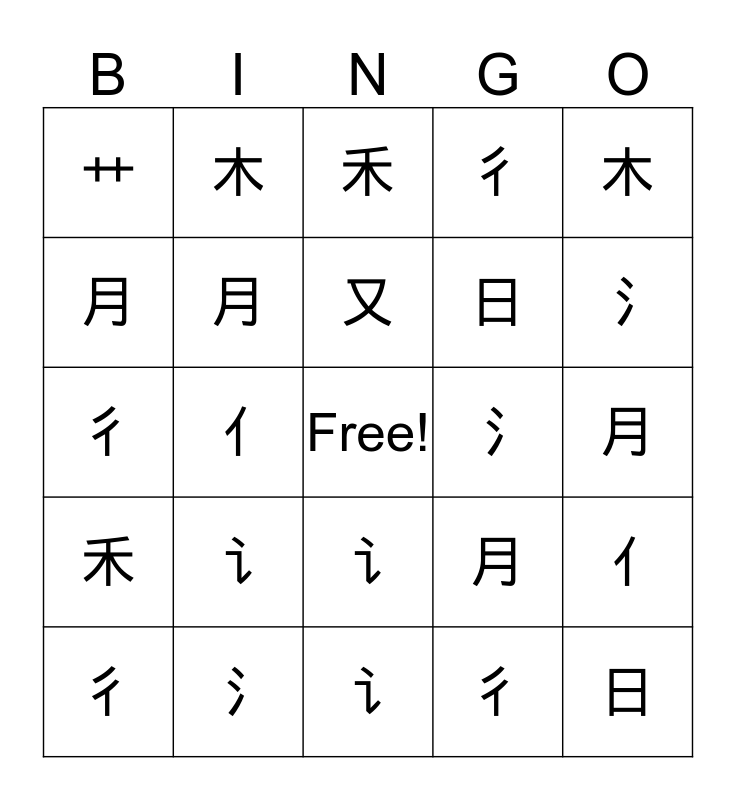 This bingo card has a free space and 40 words: 亻, 彳, 日, 月, 氵, 讠, 又, 艹, 木, 禾, 亻, 彳, 日, 月, 氵, 讠, 又, 艹, 木, 禾, 亻, 彳, 日, 月, 氵, 讠, 又, 艹, 木, 禾, 亻, 彳, 日, 月, 氵, 讠, 又, 艹, 木 and 禾.