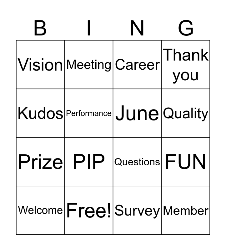 This bingo card has 16 words: Free!, FUN, Career, Vision, Prize, Meeting, Questions, Survey, Kudos, Performance, Welcome, Thank you, PIP, Quality, June and Member.
