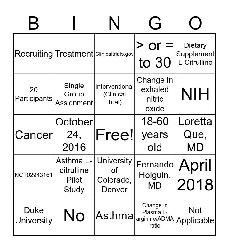 This bingo card has a free space and 25 words: Asthma L-citrulline Pilot Study, Asthma, Interventional (Clinical Trial), Duke University, Dietary Supplement L-Citrulline, Recruiting, 20 Participants, Treatment, 18-60 years old, University of Colorado, Denver, Change in exhaled nitric oxide, Cancer, Fernando Holguin, MD, April 2018, Single Group Assignment, Heather Kuehn, Loretta Que, MD, Clinicaltrials.gov, NIH, October 24, 2016, Not Applicable, No, NCT02943161, > or = to 30 and Change in Plasma L-arginine/ADMA ratio.