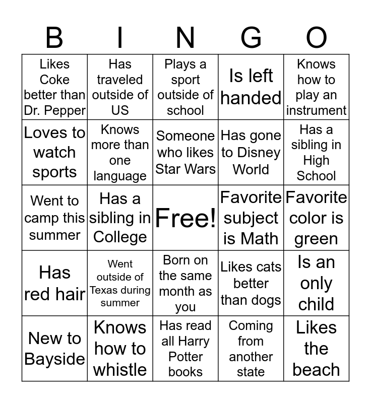 This bingo card has a free space and 24 words: Went outside of Texas during summer, Knows how to whistle, Someone who likes Star Wars, New to Bayside, Knows how to play an instrument, Likes Coke better than Dr. Pepper, Loves to watch sports, Has traveled outside of US, Favorite subject is Math, Born on the same month as you, Has gone to Disney World, Went to camp this summer, Likes cats better than dogs, Is an only child, Knows more than one language, Coming from another state, Favorite color is green, Plays a sport outside of school, Has a sibling in High School, Has a sibling in College, Likes the beach, Has red hair, Is left handed and Has read all Harry Potter books.