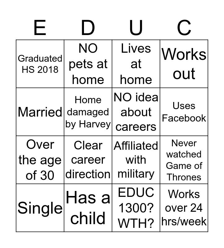 This bingo card has 20 words: Never watched Game of Thrones, Lives in Tomball, Lives at home, Lives in an apartment, Single, Married, Has a child, Graduated HS 2018, Over the age of 30, NO pets at home, Clear career direction, Affiliated with military, Home damaged by Harvey, Works over 24 hrs/week, NO idea about careers, Snapchat streak over 365 days, Uses Facebook, Works out, EDUC 1300? WTH? and Took summer vaca outside of TX.