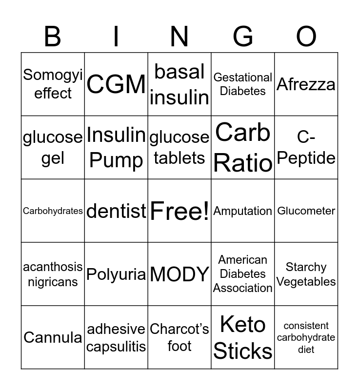 This bingo card has a free space and 77 words: type 1, type 2, basal insulin, prandial insulin, sliding scale, holding parameters, sick plan, hypoglycemia, hyperglycemia, DKA, insulin pen, glucagon emergency kit, glucose tablets, glucose gel, podiatrist, dentist, ophthalmologist, consistent carbohydrate diet, Dialysis, Afrezza, Endocrinologist, Carbohydrates, Insulin Pump, CGM, Gestational Diabetes, Glucose, Lipohyertrophy, Neuropathy, Nephropathy, Pancreas, Pre-diabetes, Retinopathy, HbA1c, American Diabetes Association, C-Peptide, Carb Ratio, Dawn Phenomenon, Gastroparesis, Glucometer, Keto Sticks, “High”, Juvenile Diabetes, LADA, Lancet, Log Sheet, Artificial Pancreas, Cannula, Somogyi effect, Microalbumin, IDDM, NIDDM, MODY, Brittle Diabetes, Glucagon, Erectile Dysfunction, Diabetes Distress, Insulin Resistance, Mixed dose, Polydipsia, Polyphagia, Polyuria, Autoimmune, Fasting Glucose, Beta Cells, BMI, Lifestyle Moderations, Smoking Cessation, Amputation, Sharps Container, Insulin Storage, Intramuscular Injection, Starchy Vegetables, acanthosis nigricans, adhesive capsulitis, adult-onset diabetes, Charcot’s foot and Dietician.